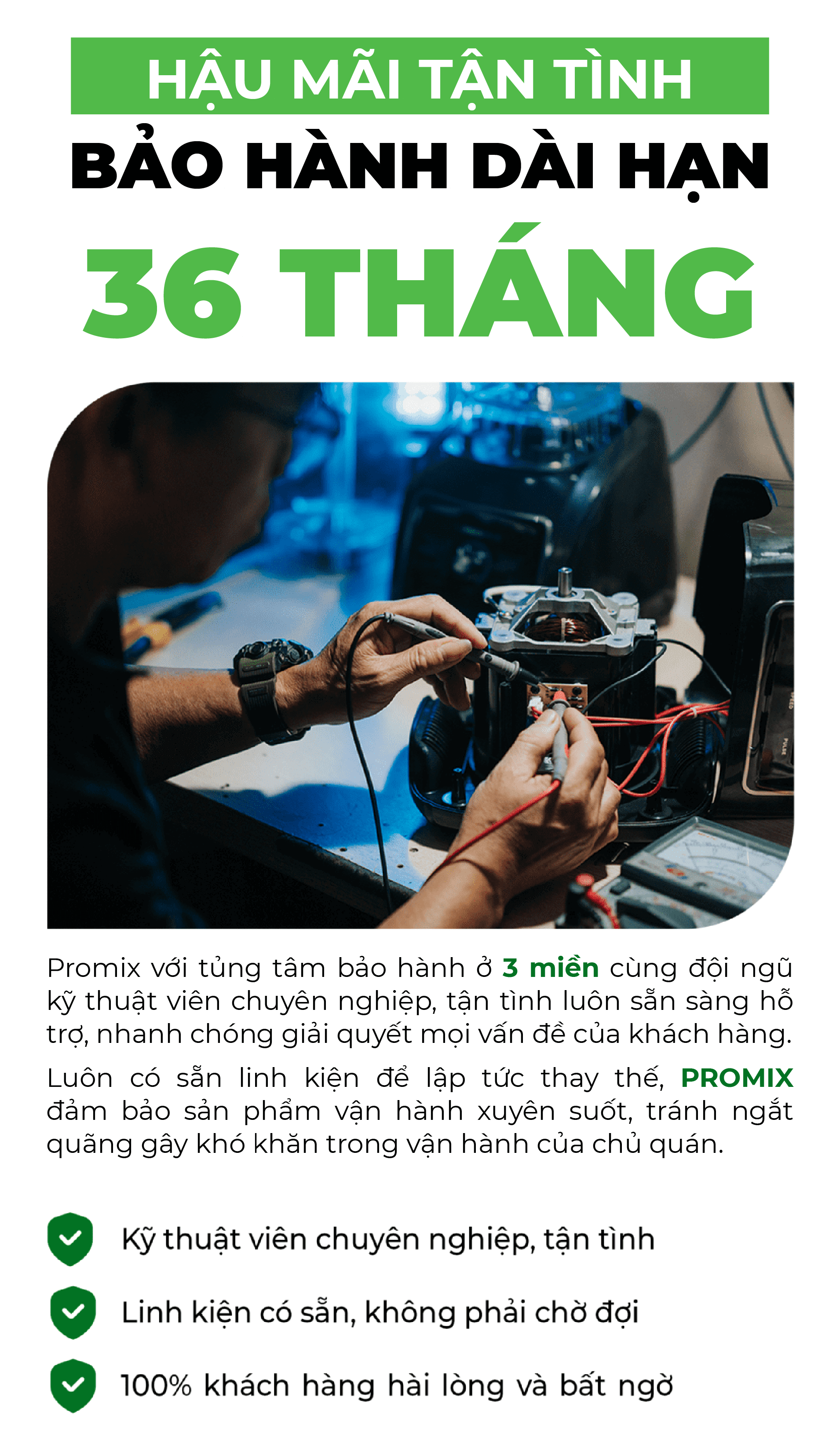 Sản phẩm không chỉ nổi bật về tốc độ mà còn về độ bền bỉ, khả năng hoạt động liên tục trong giờ cao điểm. Thiết kế thông minh, dễ dàng tháo lắp và vệ sinh giúp đảm bảo an toàn thực phẩm và sự linh hoạt khi thay đổi giữa các loại nguyên liệu khác nhau. Với mức giá đầu tư hợp lý và chính sách bảo hành 3 năm, Promix PFJ-12 chính là trợ thủ đắc lực, mang lại hiệu quả kinh doanh vượt trội cho mọi mô hình đồ uống.