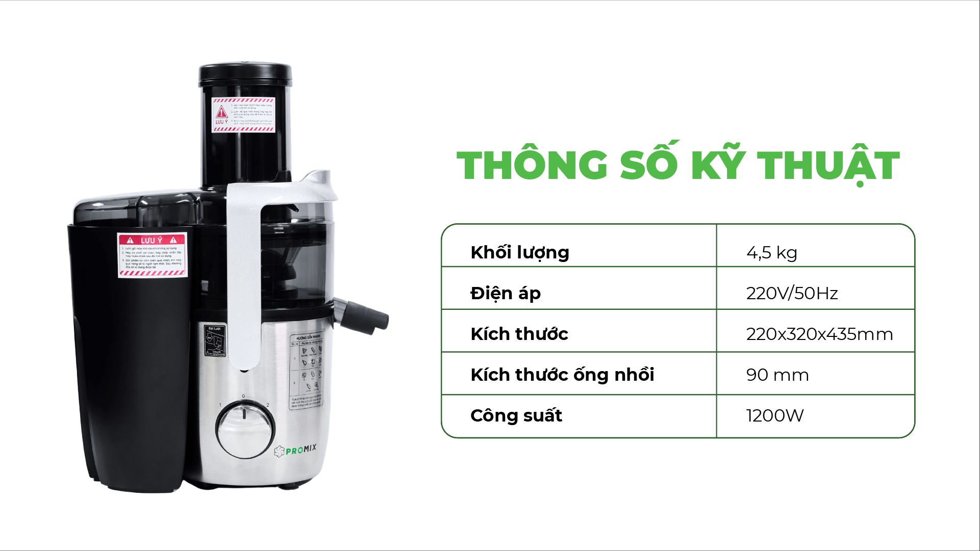 Máy ép nhanh hoa quả Promix PFJ-12 là giải pháp ép trái cây chuyên nghiệp, được thiết kế đặc biệt để đáp ứng nhu cầu hiệu suất cao của các quán nước ép, sinh tố, café, và trà hoa quả. Với công suất mạnh mẽ lên đến 1200W và ống tiếp liệu siêu lớn 90mm, PFJ-12 cho phép ép nguyên trái nhiều loại hoa quả mà không cần tốn thời gian cắt nhỏ, giúp tối ưu hóa quy trình pha chế và tiết kiệm chi phí nhân công.