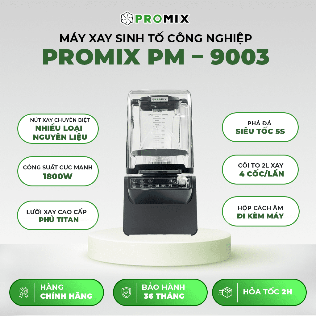 Với thiết kế vững chãi, vật liệu bền bỉ, công suất mạnh mẽcùng nhiều tính năng ưu việt, Promix PM – 9003chính xác là cánh tay đắc lực cho chủ quán trong ứng dụng đồ uống đá xay, sinh tố, smoothie…